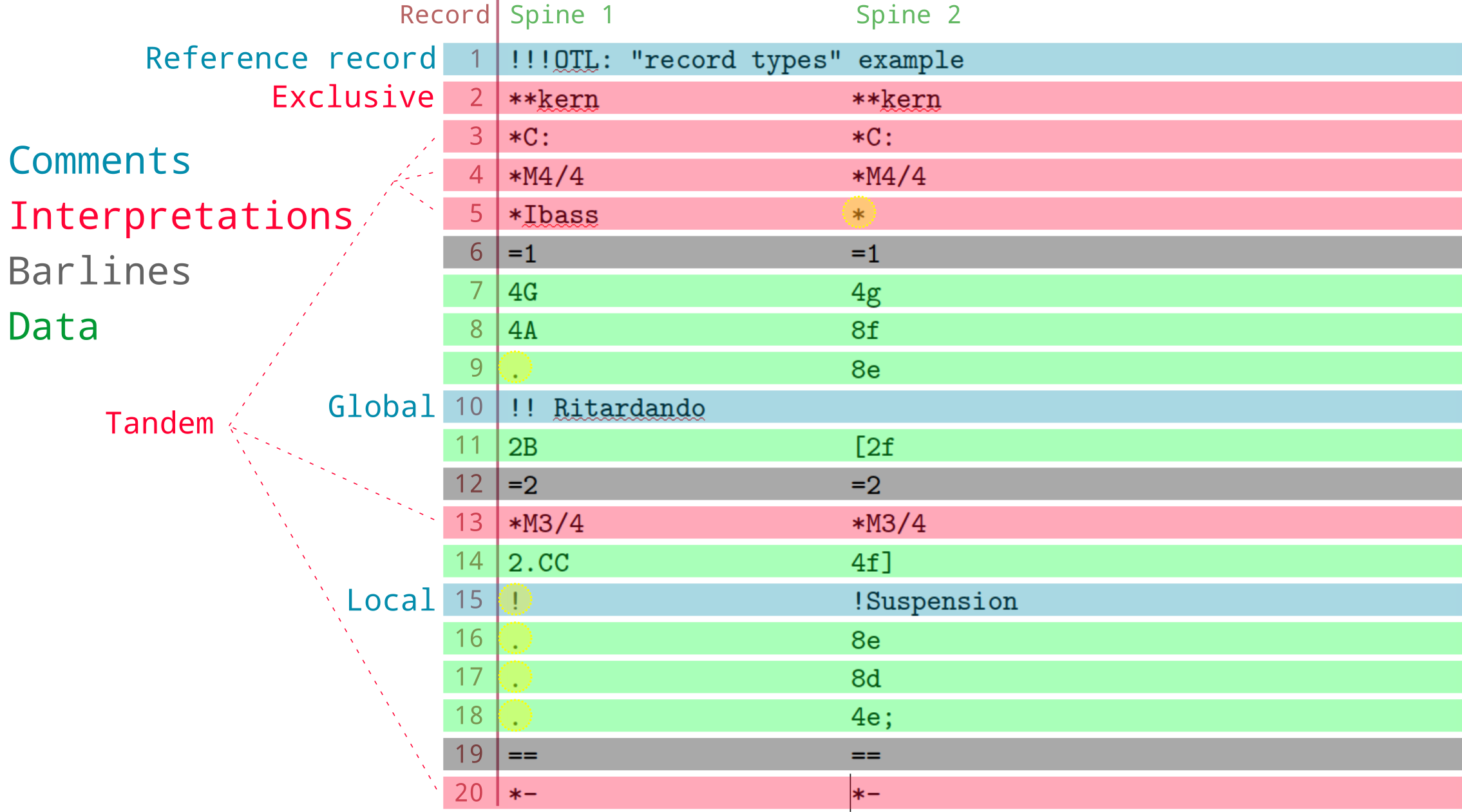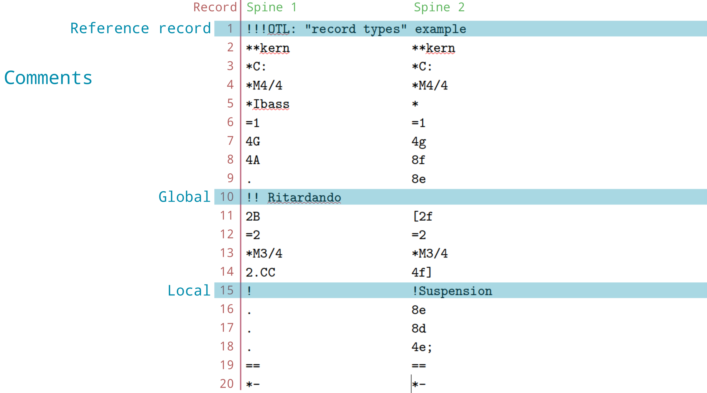 The humdrum syntax recognizes four broad types of records, with five sub-types: