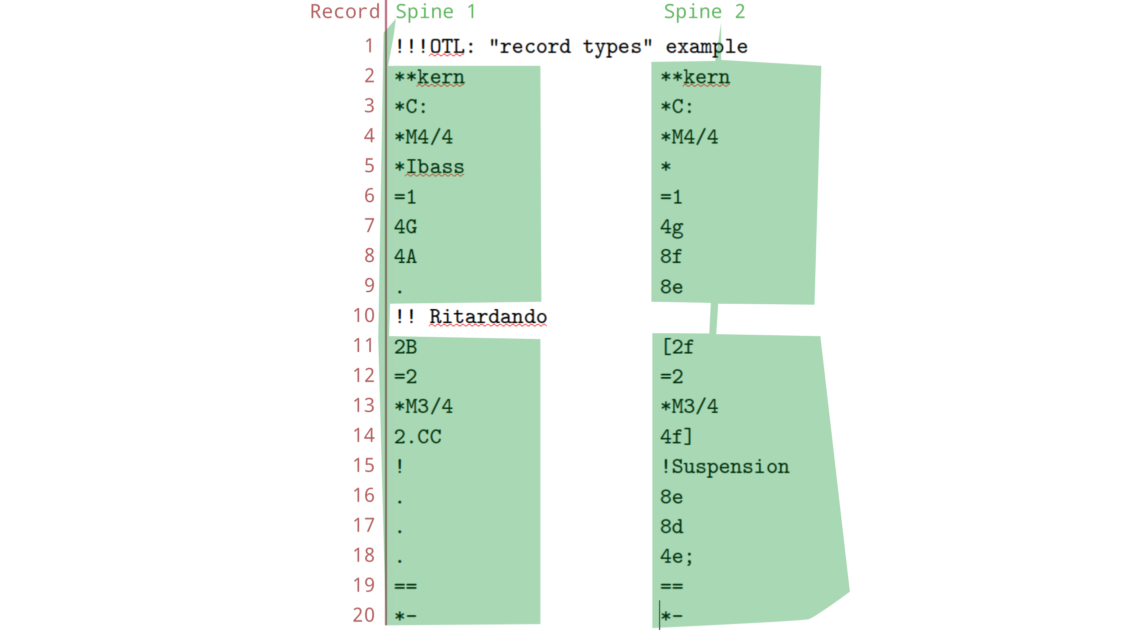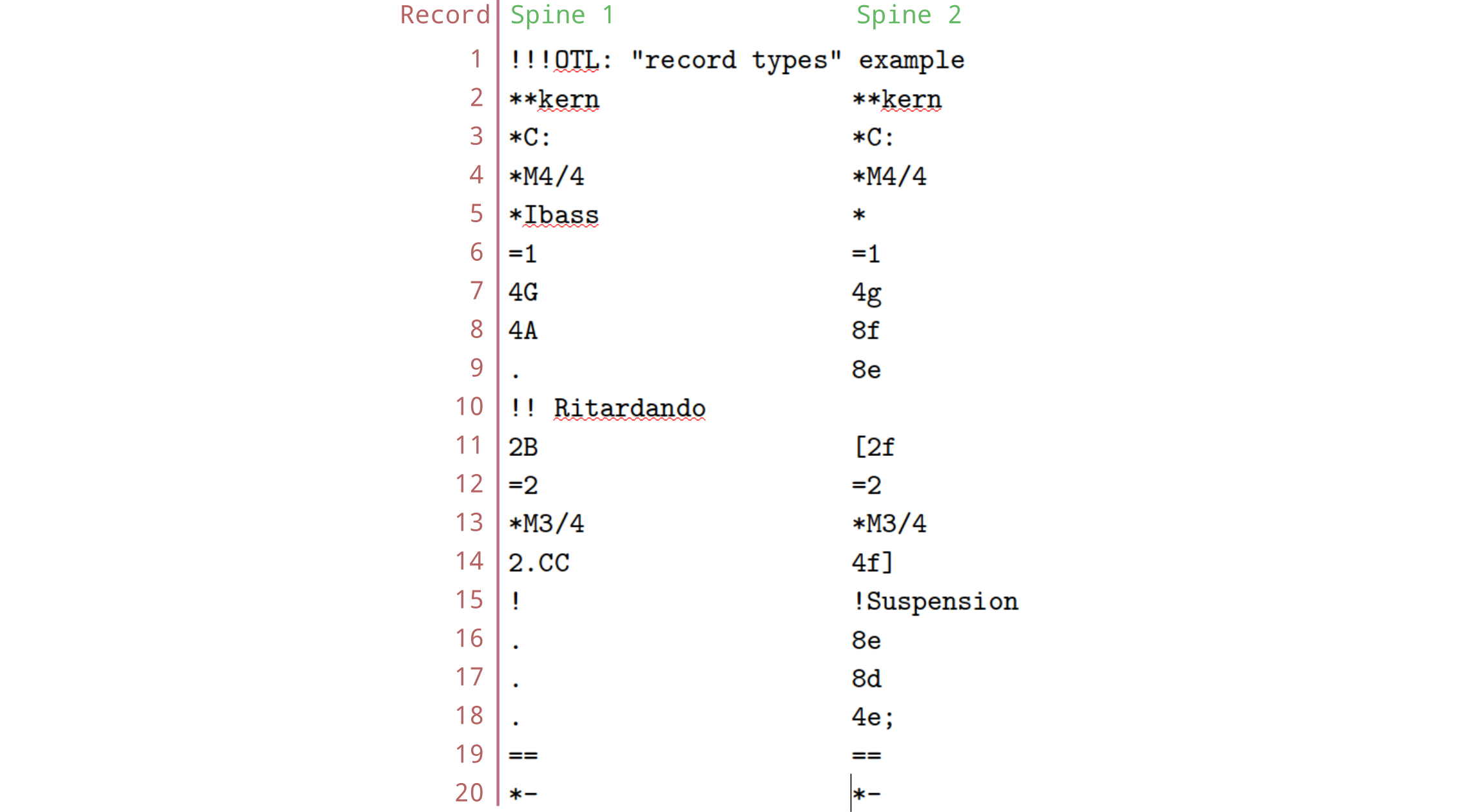 This file has two columns of data, separated by tabs. However, we have special terminology that we use: The “columns” in a humdrum file are called spines. Each line, or row, in the file is called a record.