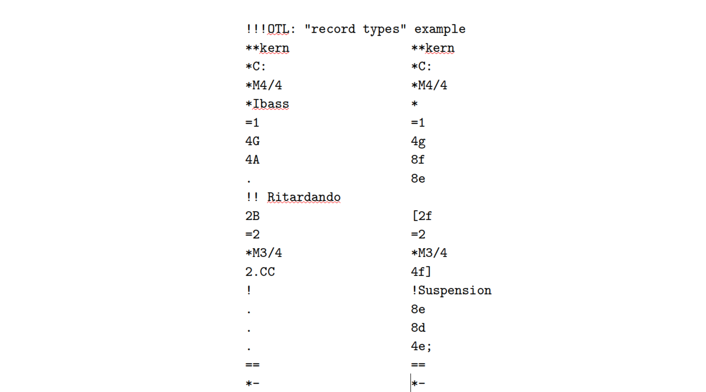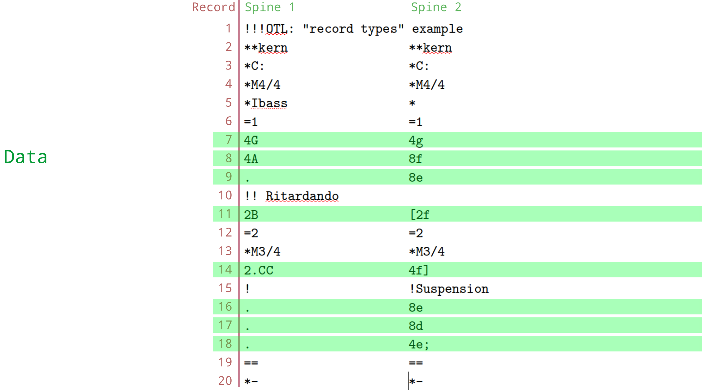 There is one fundamental assumption regarding how the humdrum syntax encodes information: as we travel downward through a file (from top to bottom) we are encoding information in the order it occurs in time. This is true of data records—interpretation and comment records are all associated with the moment in time of the first data record that occurs below them. Information that appears in the same record (within one spine, or in different spines) is assumed to happen at the same time.
